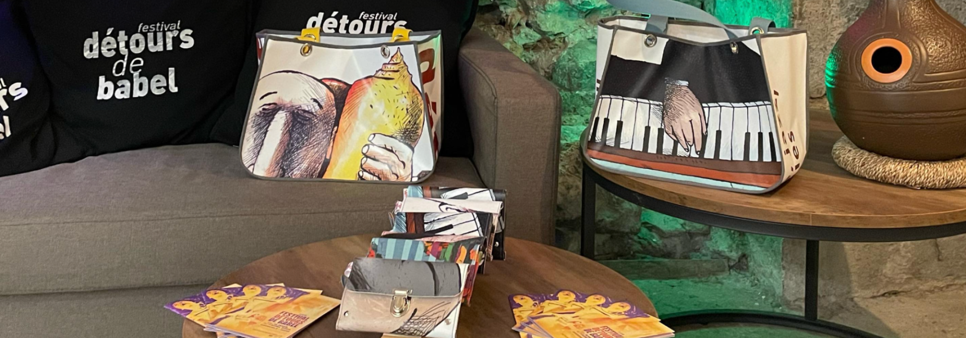 Après quinze éditions du festival des Détours de Babel, les bâches aux anciennes couleurs Détours de Babel se sont accumulées dans nos bureaux. Depuis deux ans, nous avons décidé de leur donner une seconde vie en les confiant aux mains d’IsaBelChoz, afin qu’elle crée cette collection de produits uniques et locaux. Les modèles sont des créations originales et la confection 100% française se fait depuis son atelier à Theys.